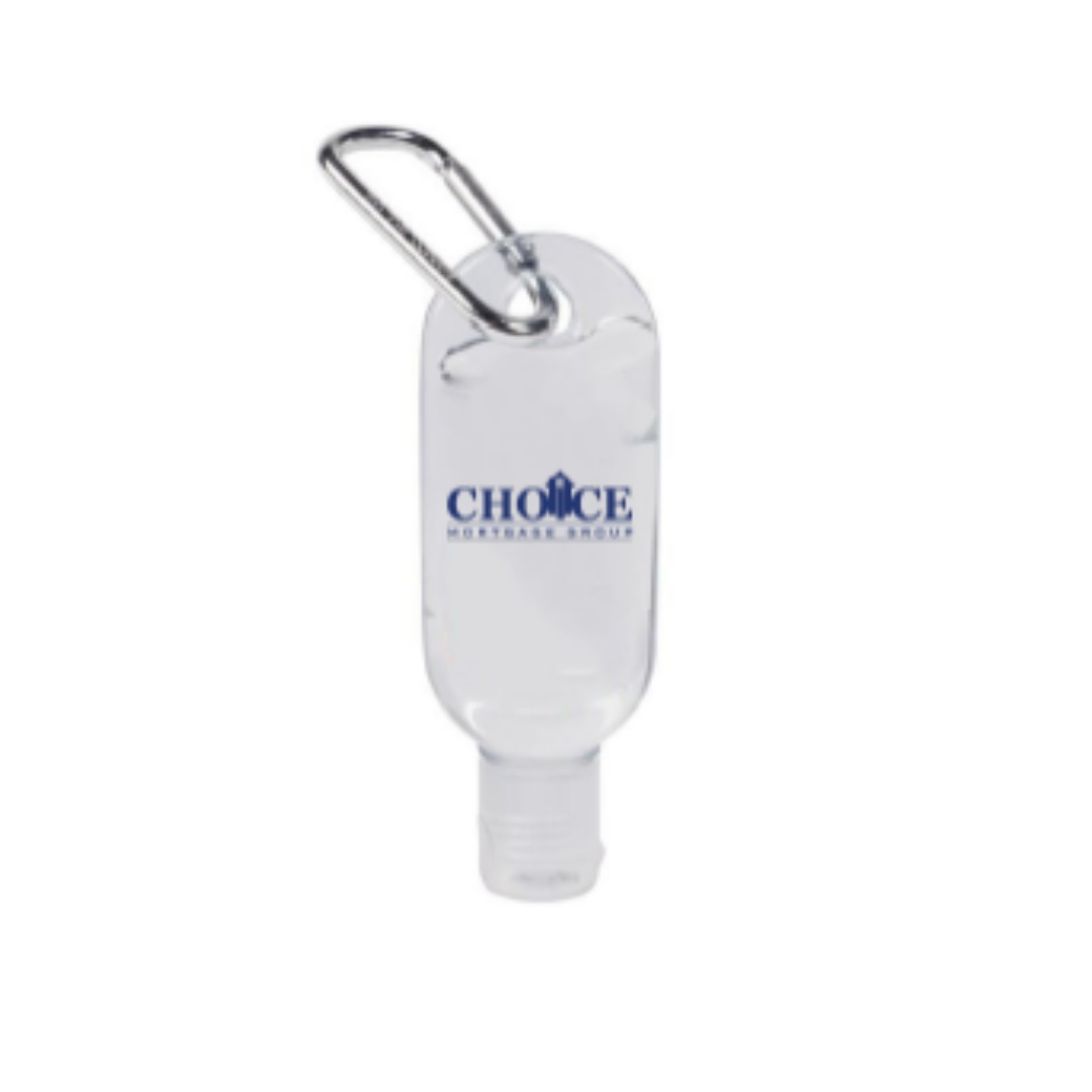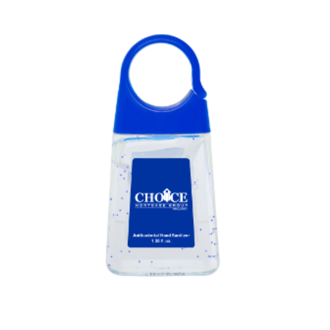 Portable antibacterial hand gel with clip for on-the-go use. 150 minimum quantity.