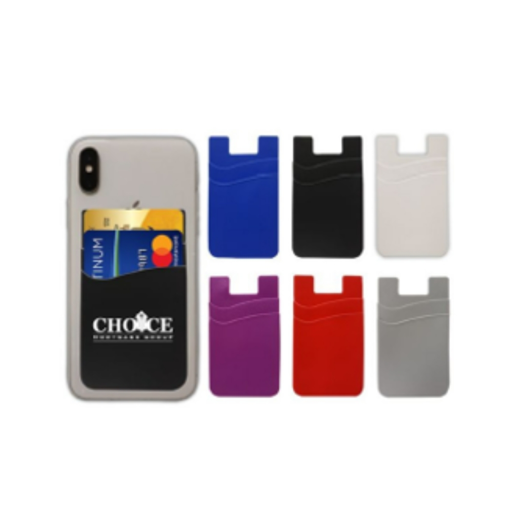Adhesive silicone phone wallet with dual pockets for storage. 250 minimum quantity.